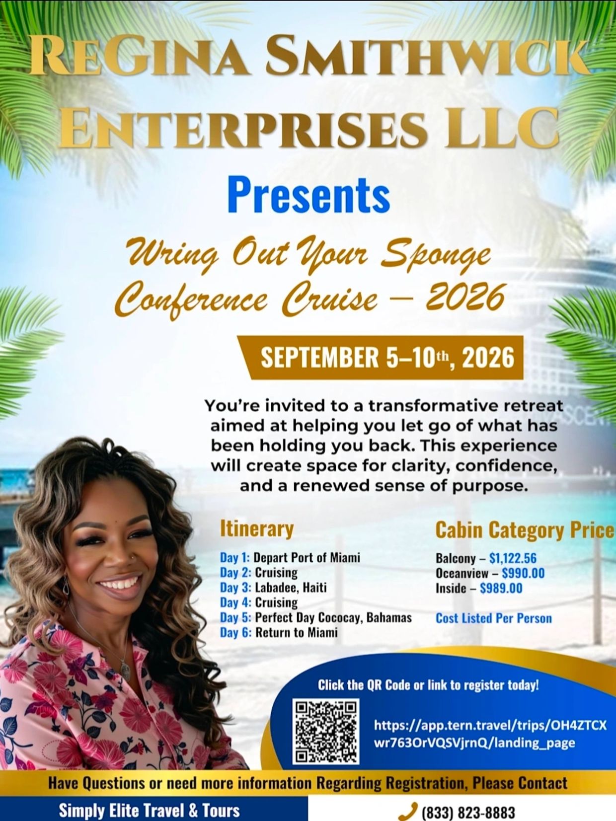 The Wring Out Your Sponge Conference Cruise is a transformational getaway designed to help you release what’s been weighing you down and make room for clarity, confidence, and purpose. While sailing the beautiful Caribbean, you’ll experience empowering workshops, inspiring speakers, and soul-nourishing connections—all created to help you reset, refocus, and rise. This cruise is more than a vacation… It's a life-changing journey toward becoming the best version of YOU.